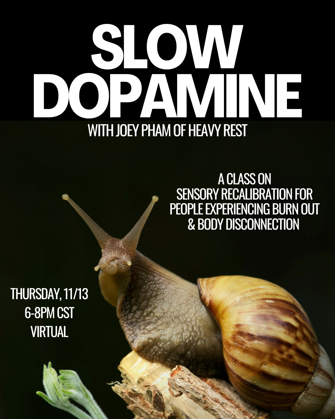 In this class, we will be exploring the body's language to signal for specific types of care when it comes to burnout from dopamine depletion. We are diving deep into the sources, how overculture conditions us to be addicted to dopamine, and how to sustainably move out of the vicious cycle of constant stimulation and depletion.